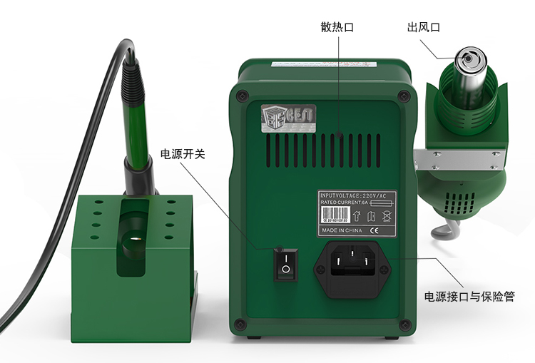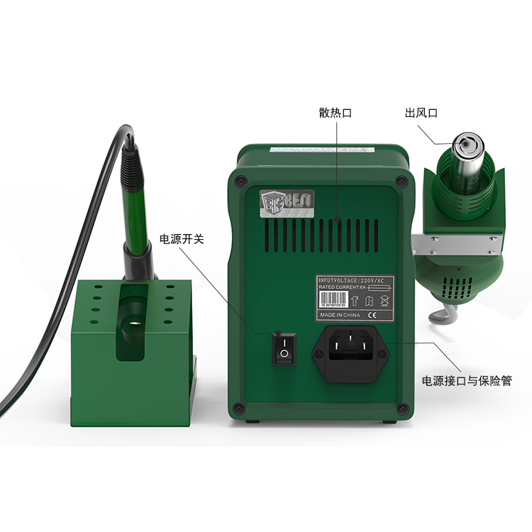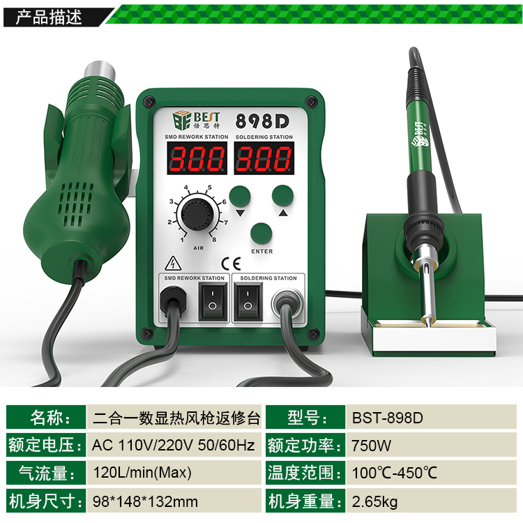 ? 產(chǎn)品名稱: 二合一雙數(shù)顯智能無(wú)鉛螺旋式熱風(fēng)槍+焊臺(tái)