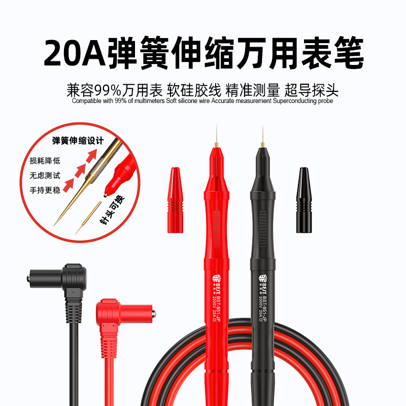 BST-951-JP 彈簧式超導(dǎo)細尖表筆 萬用表表筆線 特尖鍍金彈簧針 防燙防凍硅膠線 20A大電流 表棒鍍金純銅特尖表針可換頭