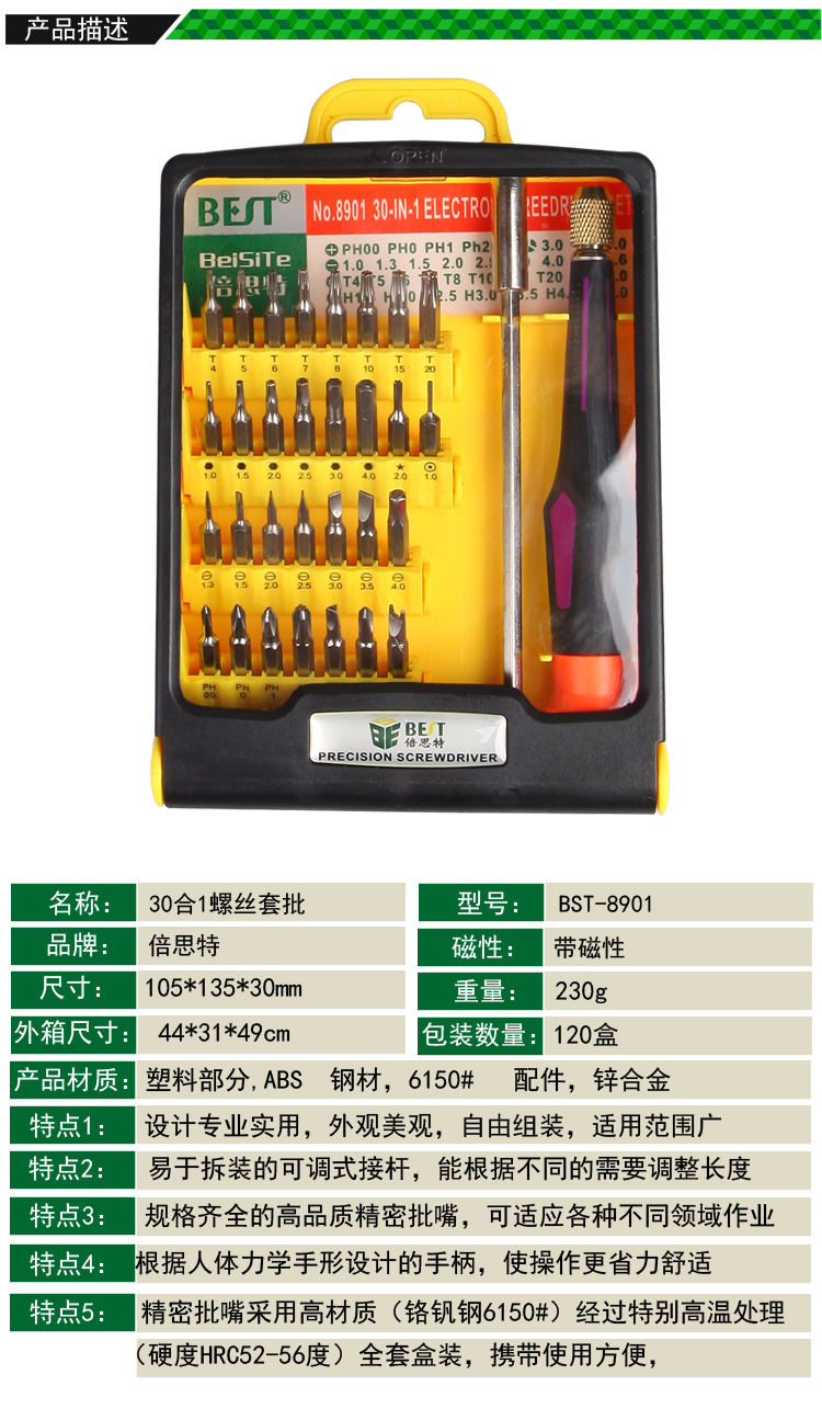 ? 產品名稱: 螺絲刀套裝30合1? 產品型號: BST-8901? 產品類別: 螺絲批系列