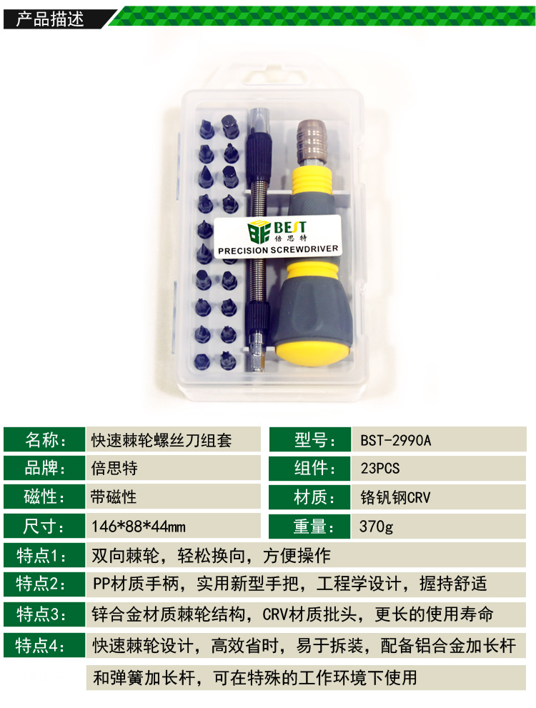 返回當前位置: 首頁 / 產(chǎn)品中心 / BST-2990A 23件套 快速棘輪螺絲刀組套