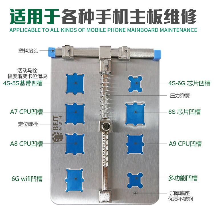 返回當前位置: 首頁 / 產(chǎn)品中心 / BST-001D 加厚型維修卡具帶IC凹槽 維修夾具平臺(銀色)