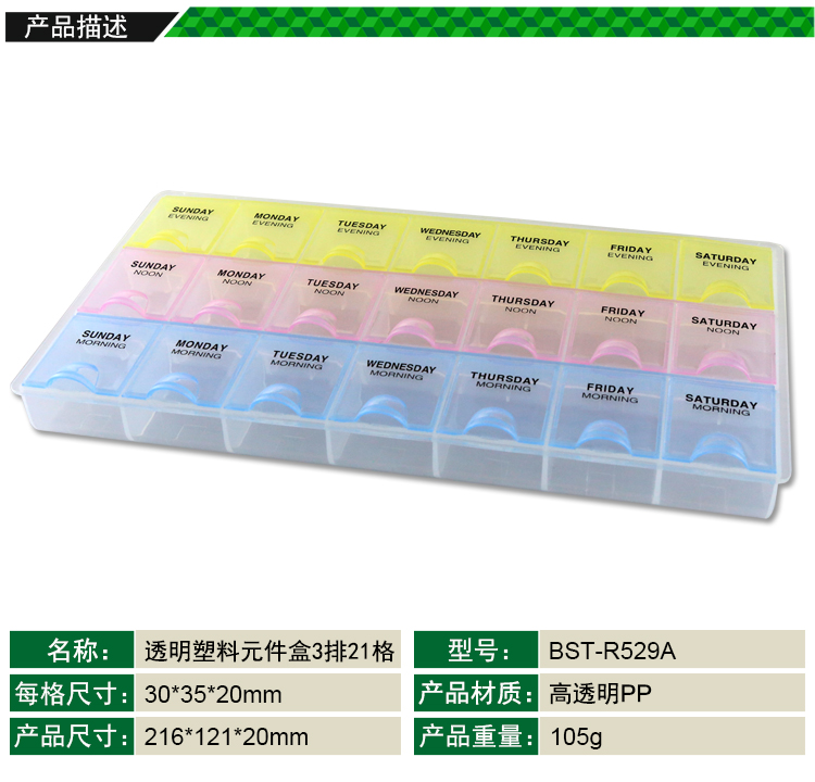 返回當(dāng)前位置: 首頁(yè) / 產(chǎn)品中心 / BST-R529A 3排7格星期透明塑料元件盒(小)