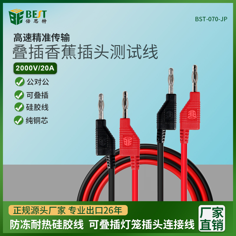 返回當(dāng)前位置: 首頁 / 產(chǎn)品中心 / BST-070-JP 超導(dǎo)傳輸疊插香蕉插頭測(cè)試線 4mm燈籠插頭電力測(cè)試導(dǎo)線 公對(duì)公4MM香蕉插頭轉(zhuǎn)香蕉頭硅膠線高壓線 2000V20A大電流